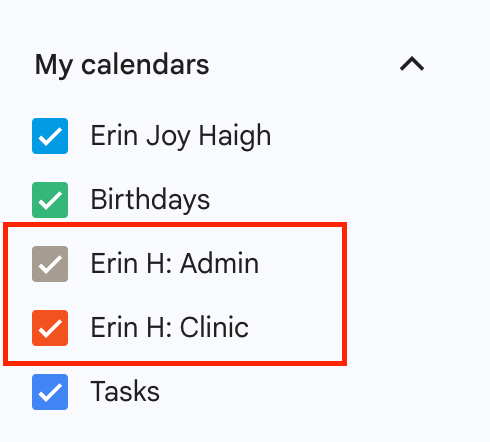 Confirm you see both calendars (Clinic and Admin) checked on under “My Calendars” (left hand side of the window under the current month)