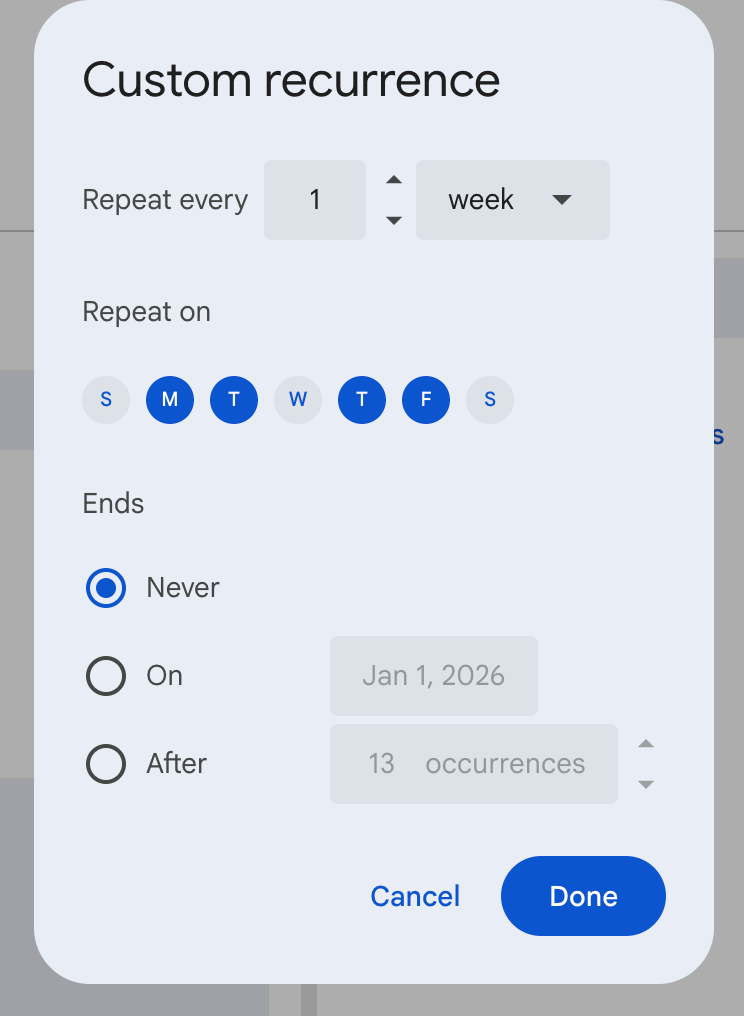 - Choose “Weekly on [Day]” to repeat the event on the same day each week (for example, every Friday).