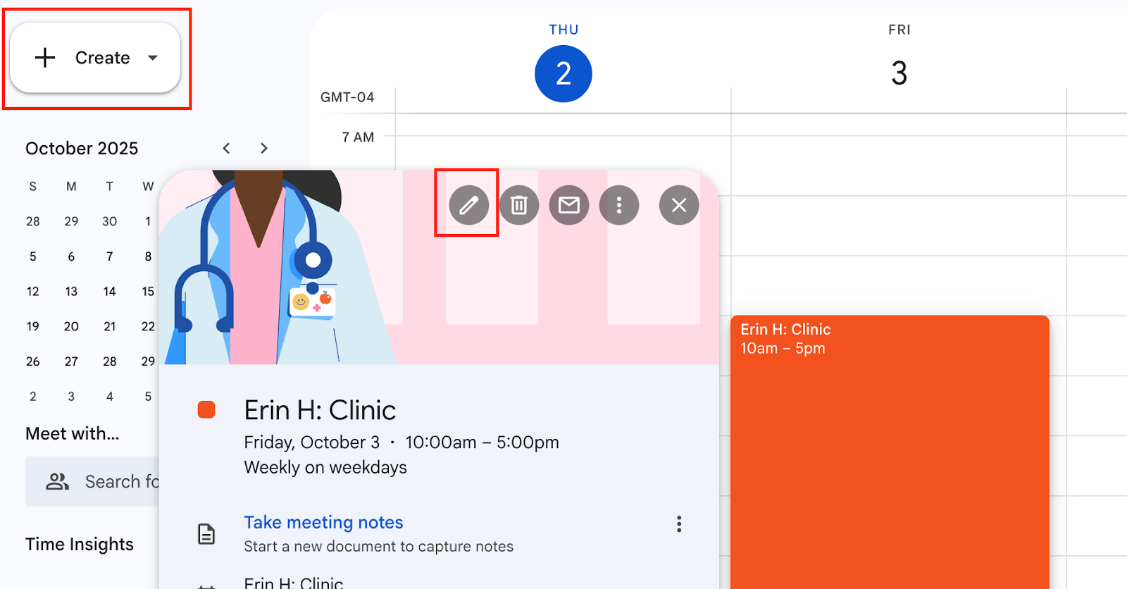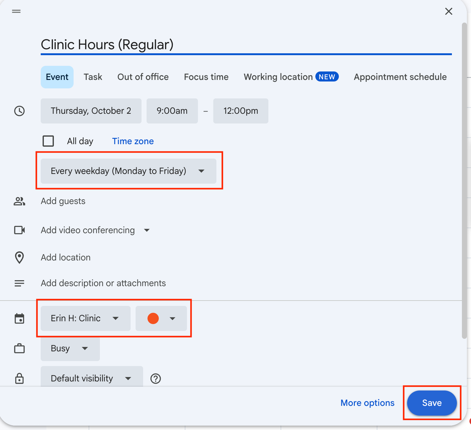 ✅ Do this: Create the calendar events to indicate when you want to be available or unavailable for patient visits. You can create repeating calendar events to have the same schedule repeat over days, weeks, etc.