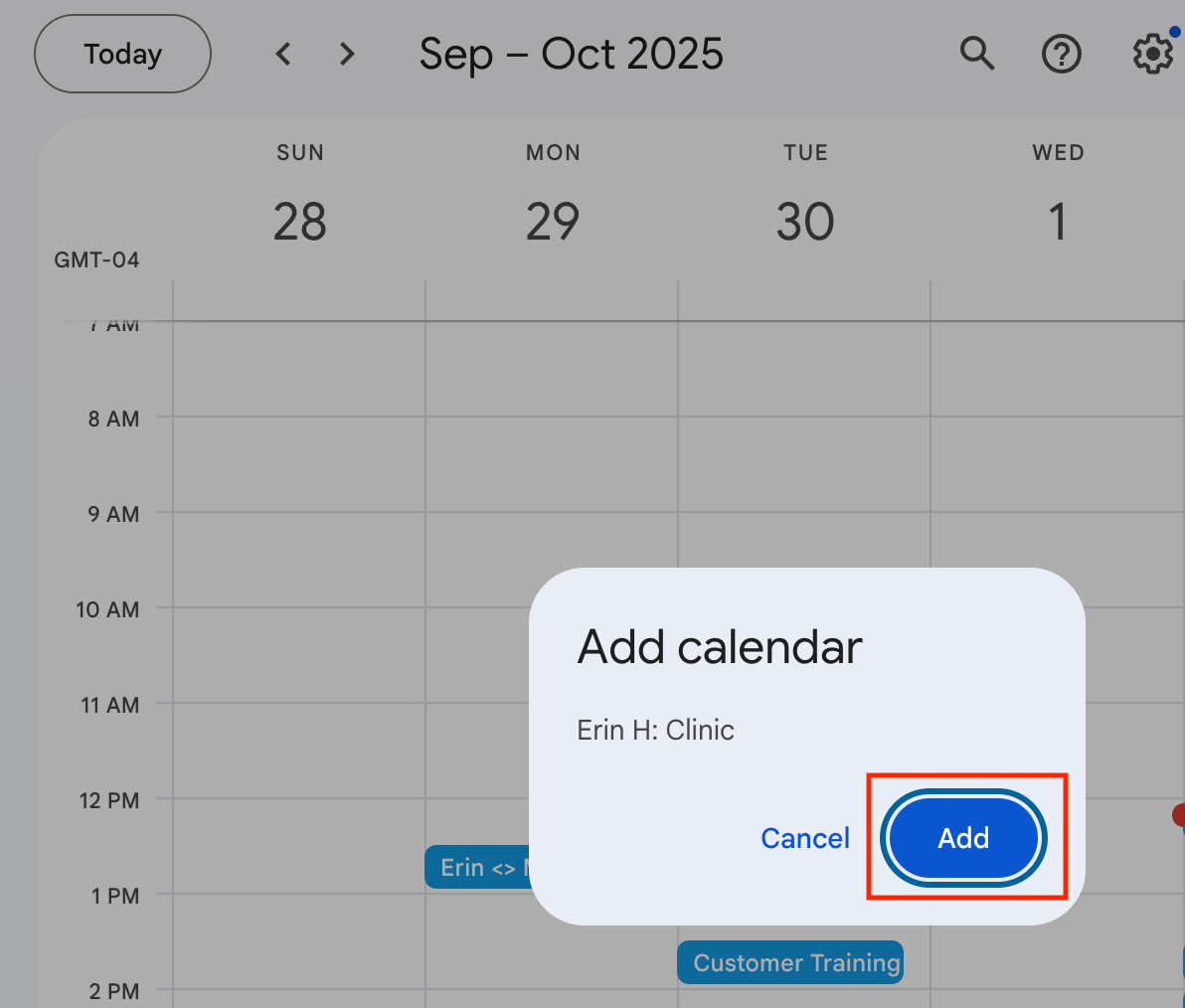 ✅ Do this: Click “Add” to add the shared calendar to your calendars